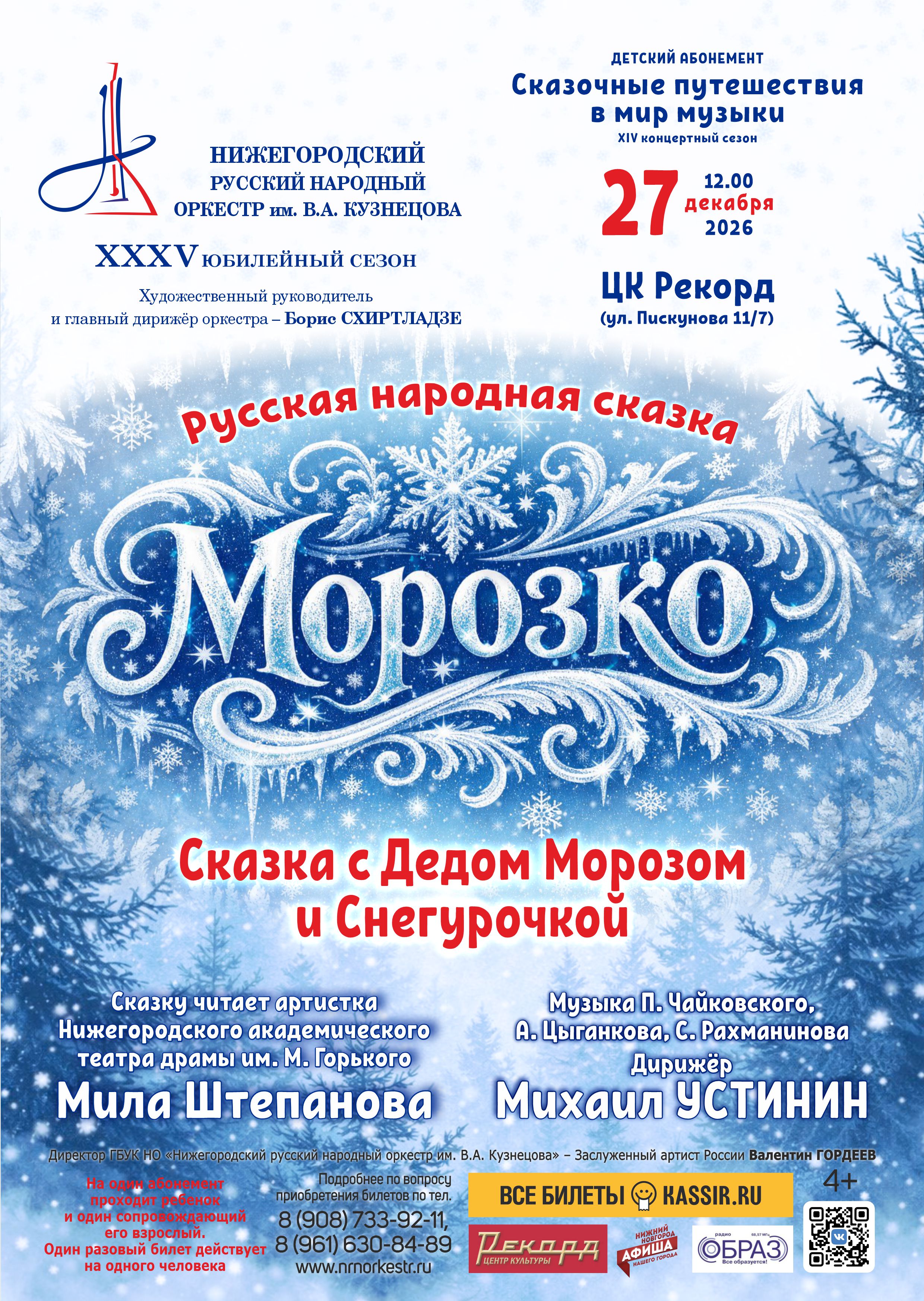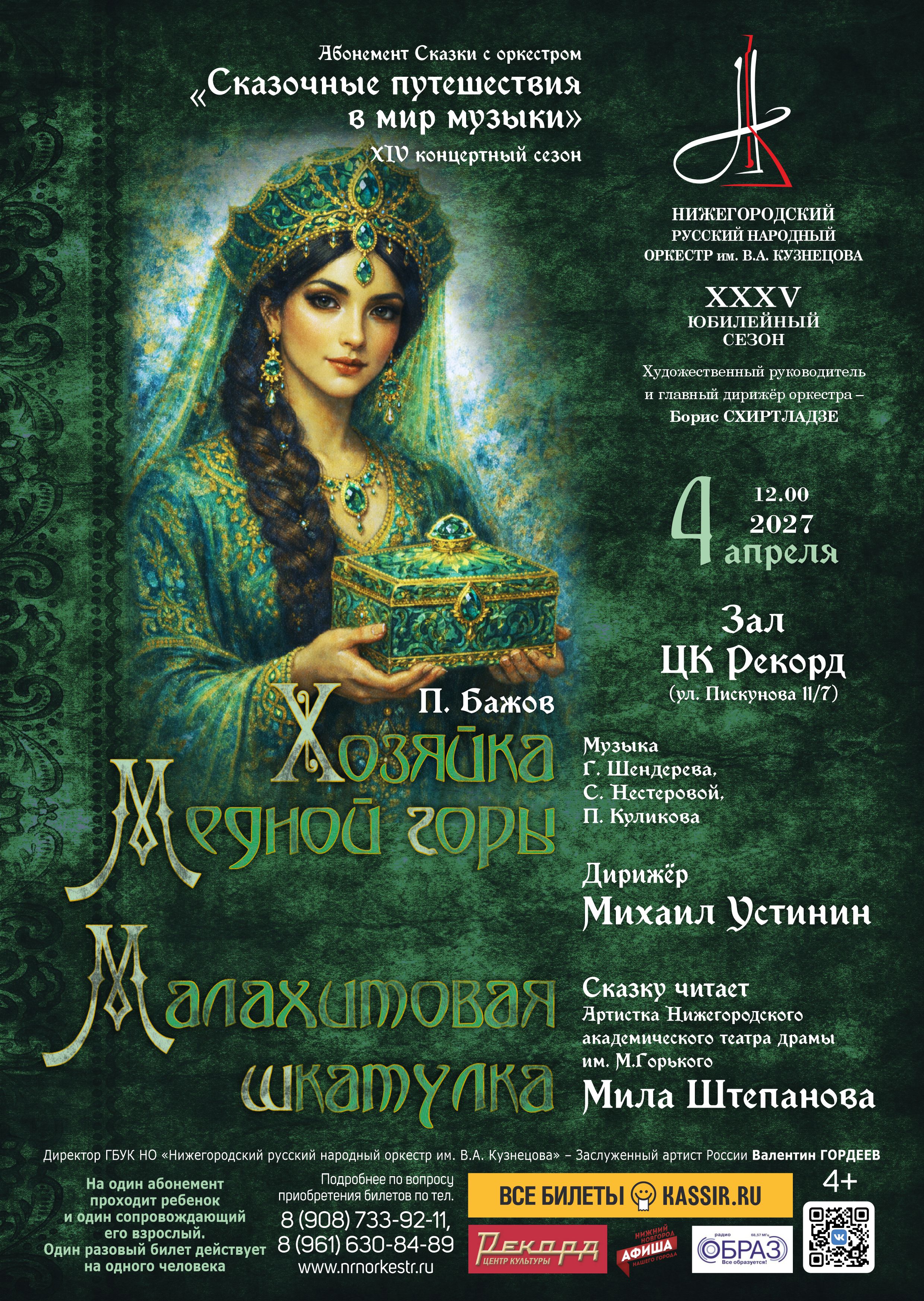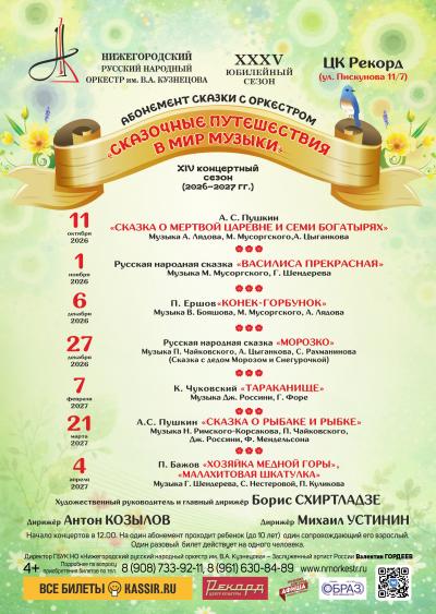Абонемент включает в себя семь сказок - семь шедевров авторской русской литературы и шедевры народного творчества. Все сказки исполняются артистами Нижегородского академического театра драмы им. М. Горького в сопровождении шедевров отечественной и зарубежной классики в исполнении НРНО им. В.А. Кузнецова.